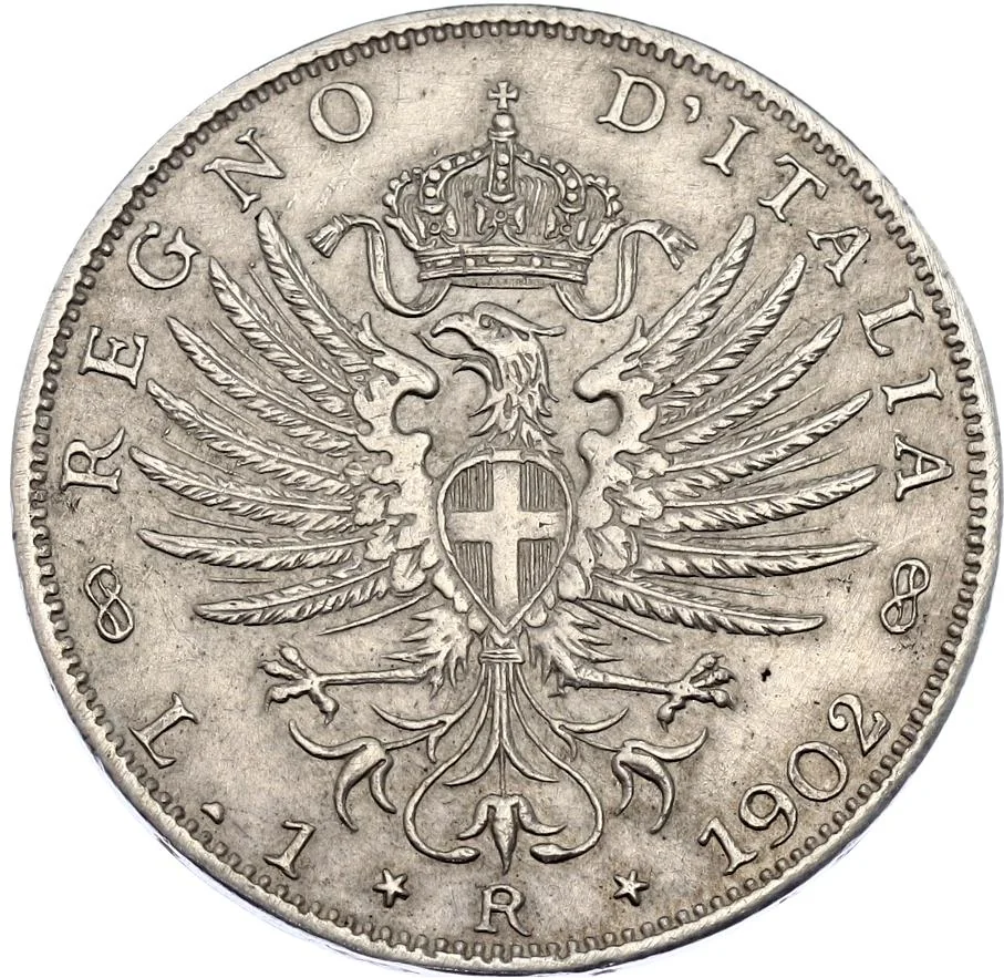 A crowned heraldic eagle with the Savoia shield, flanked by value and date, mintmark below.