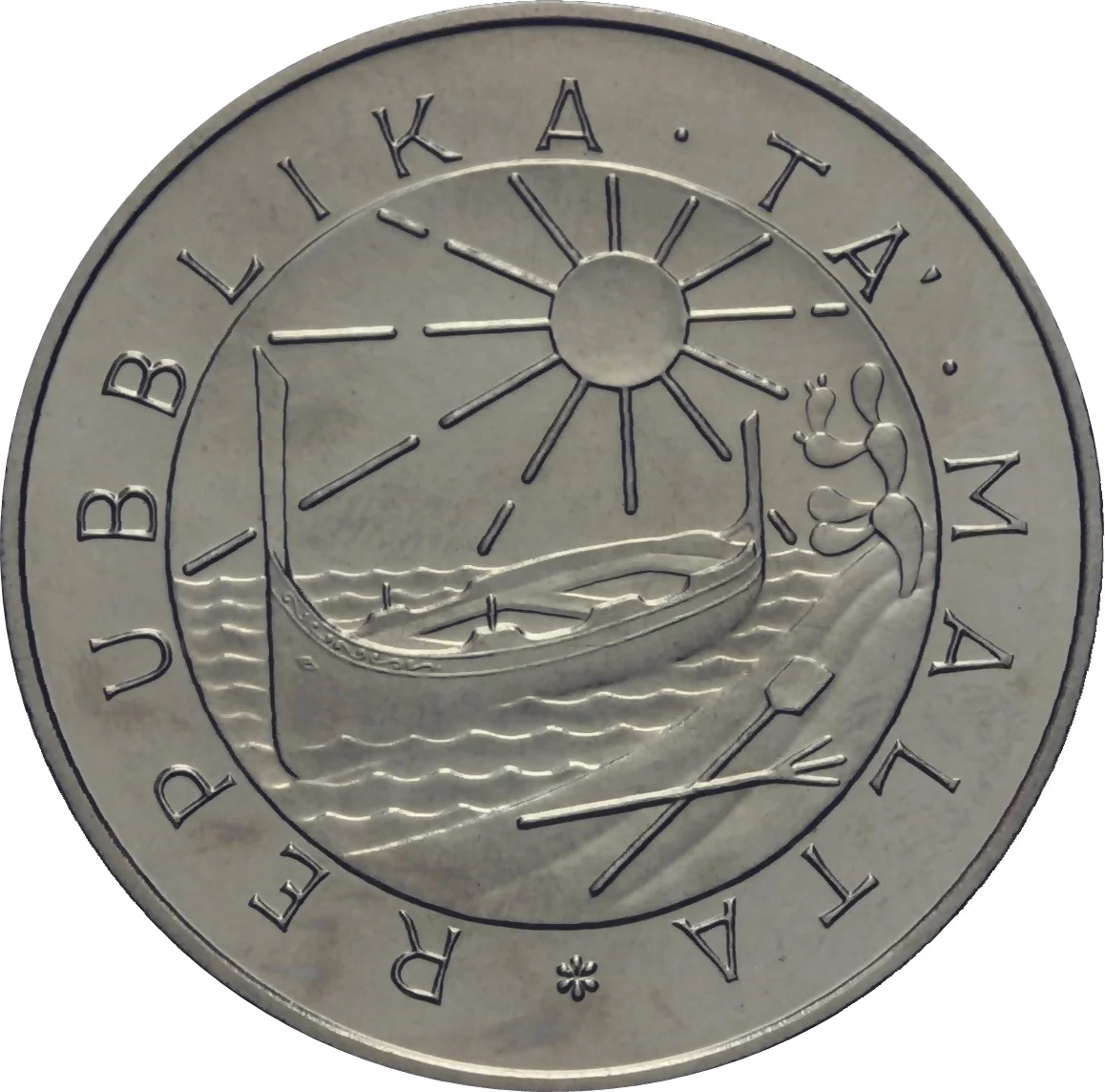 Coat of arms featuring a rising sun over a coastal scene with a Maltese luzzu boat, a shovel, a pitchfork, and an Opuntia plant.