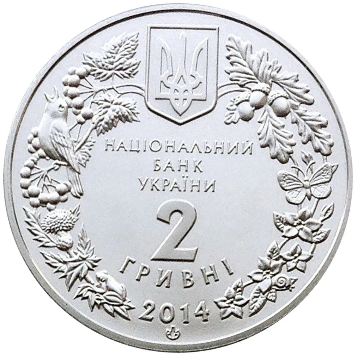 Encircled by flora and fauna, the coin features the Small Coat of Arms of Ukraine and the inscriptions: НАЦІОНАЛЬНИЙ БАНК УКРАЇНИ / 2 ГРИВНІ / 2014, along with the Mint's mark.
