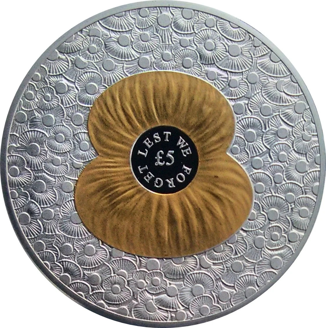 One hundred poppies encircling a larger gold poppy with central lettering.