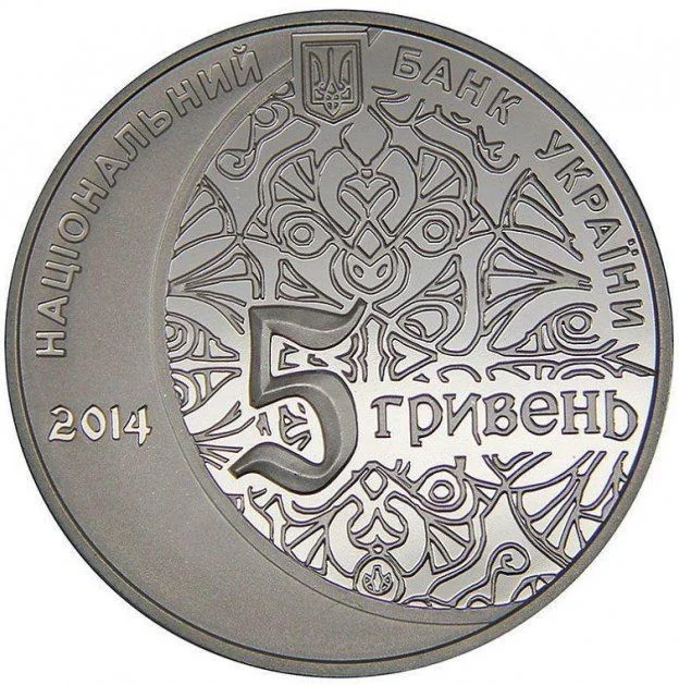 Above: Ukraine's Small Coat of Arms with the inscription НАЦІОНАЛЬНИЙ БАНК УКРАЇНИ and the year 2014 below left. Centered on an ornamental pattern are the face value 5 ГРИВЕНЬ and the Mint mark.