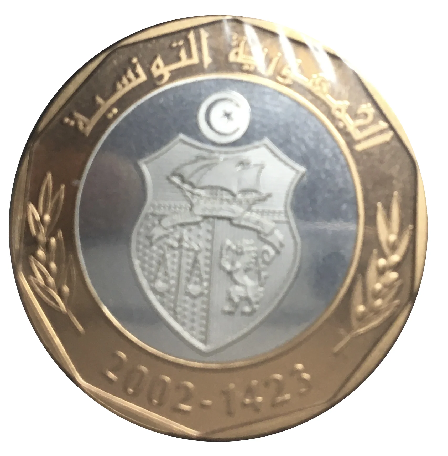 Tunisian coat of arms with Gregorian and Islamic years, framed by sprigs.