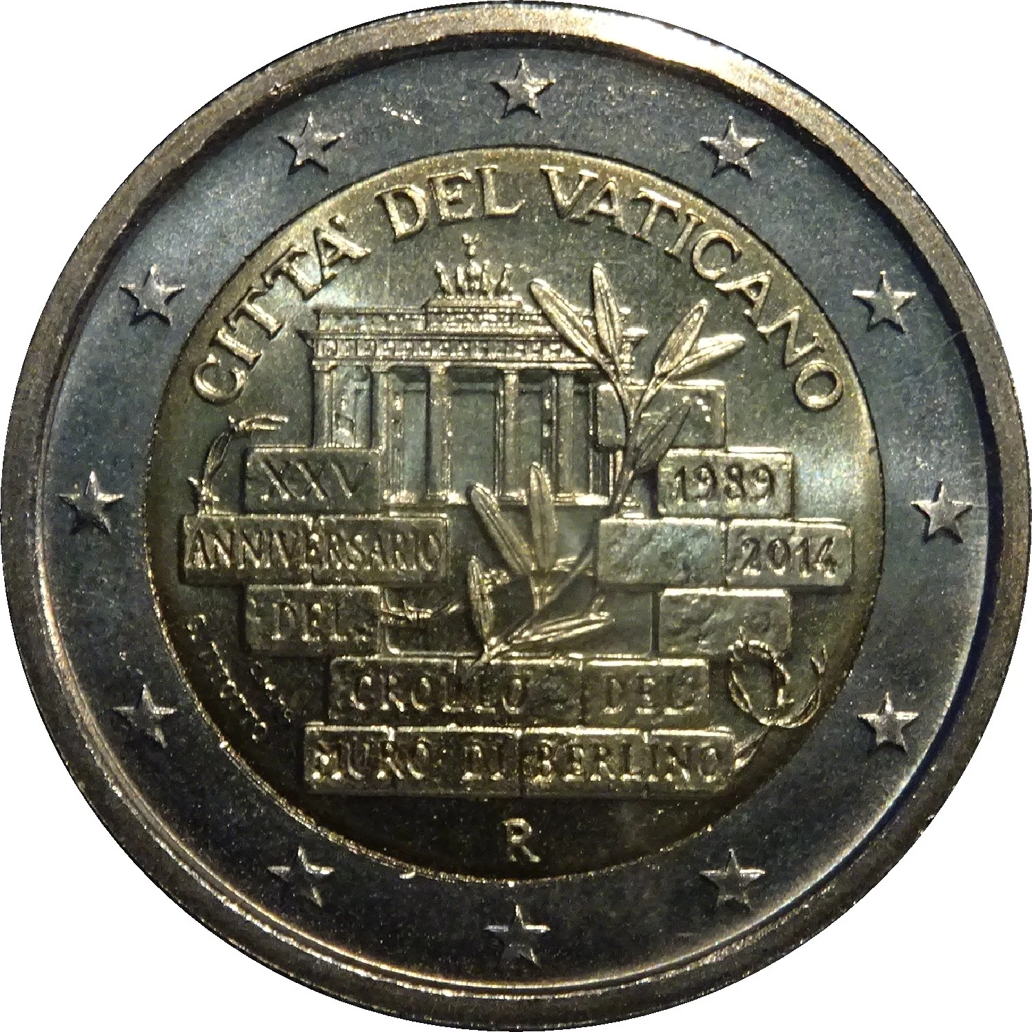 Description: The design shows partially collapsed Berlin Wall bricks in the foreground, featuring the inscription ‘XXV ANNIVERSARIO DEL CROLLO DEL MURO DI BERLINO 1989 2014’. An olive branch and barbed wire appear in a central gap, with the Brandenburg Gate in the background. ‘CITTA’ DEL VATICANO’ is at the top, and the European Union's 12 stars are on the coin's outer ring.