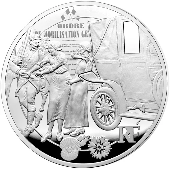 A mobilization order shows men departing for the front. The back of a cab evokes the Battle of the Marne, while a poppy and cornflower honor French and Commonwealth soldiers.