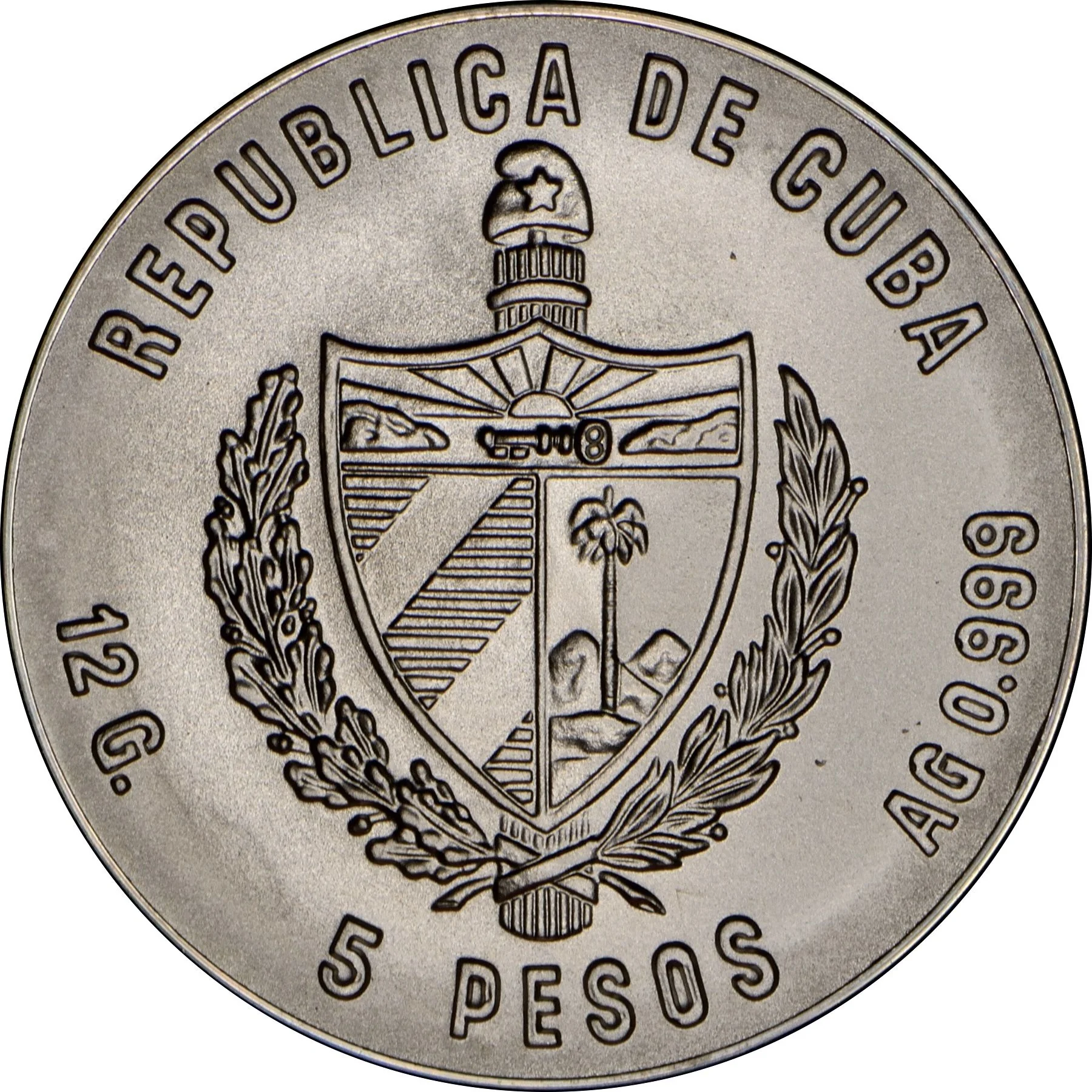 Cuban coat of arms with country name above, weight and fineness on the sides, and face value below.