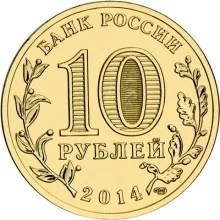 Center: "10 ROUBLES" with holographic "10" and "РУБ" inside the zero. Flanked by olive and oak branches. Top: "BANK OF RUSSIA". Bottom: date "2014".