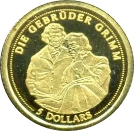 Jacob and Wilhelm Grimm; one stands, the other sits thoughtfully with a book. Legend above, value below.