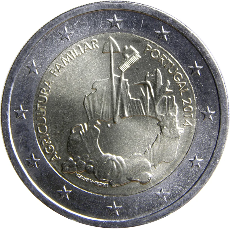 Traditional farming tools central, with a chicken, pumpkins, potatoes in a basket, and other produce. Left semicircle: "AGRICULTURA FAMILIAR". Right semicircle: country name and date. Mintmark at bottom left. Outer ring features the 12 EU stars.