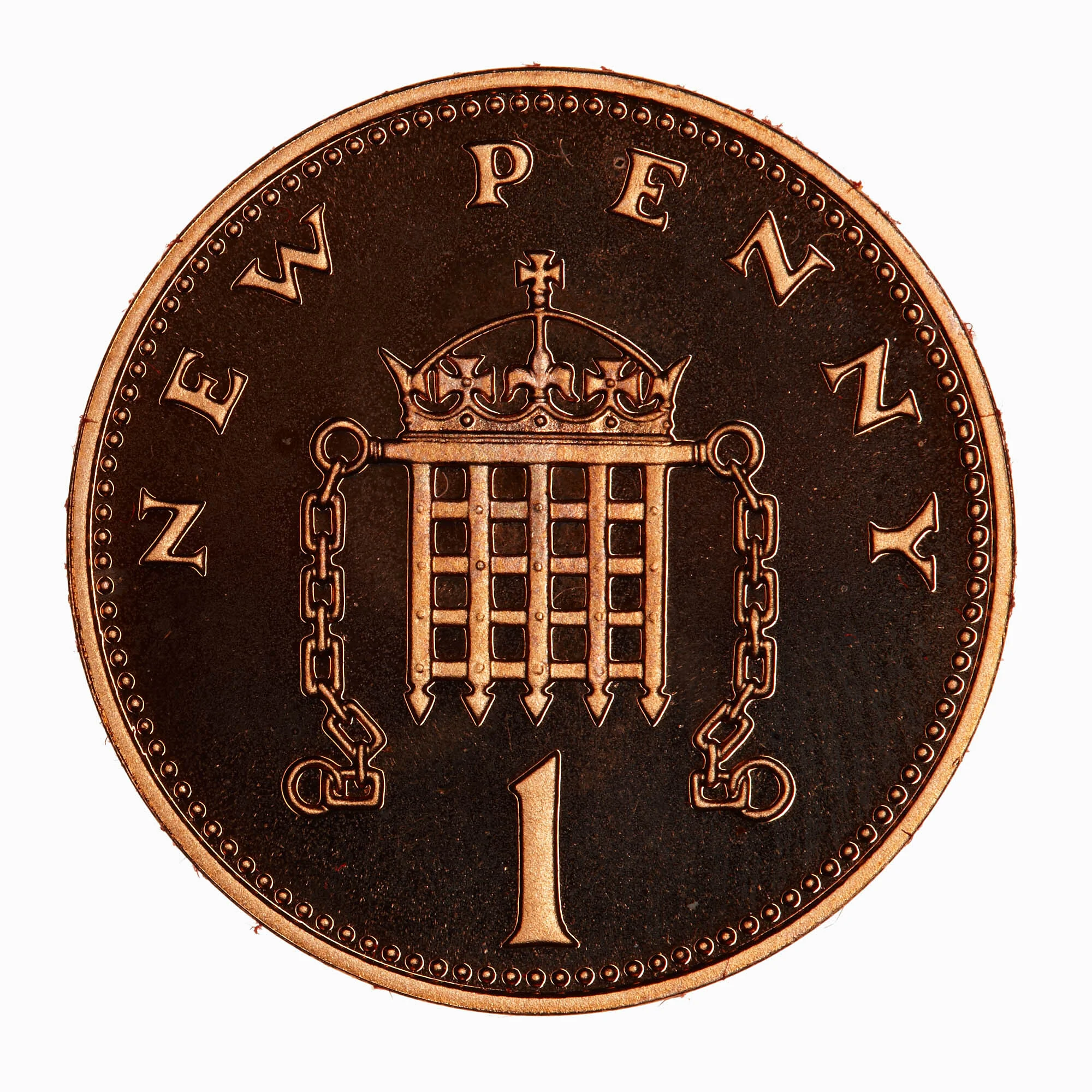 A crowned portcullis with chains (adapted from the Badge of Henry VII) and the face value.