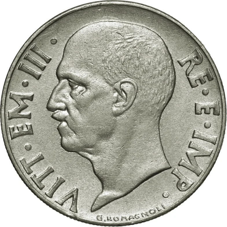 A right-facing female head (Italy) behind a fasces adorned with a Savoy shield. The value is below, between the date and the mintmark with the Fascist Era year.