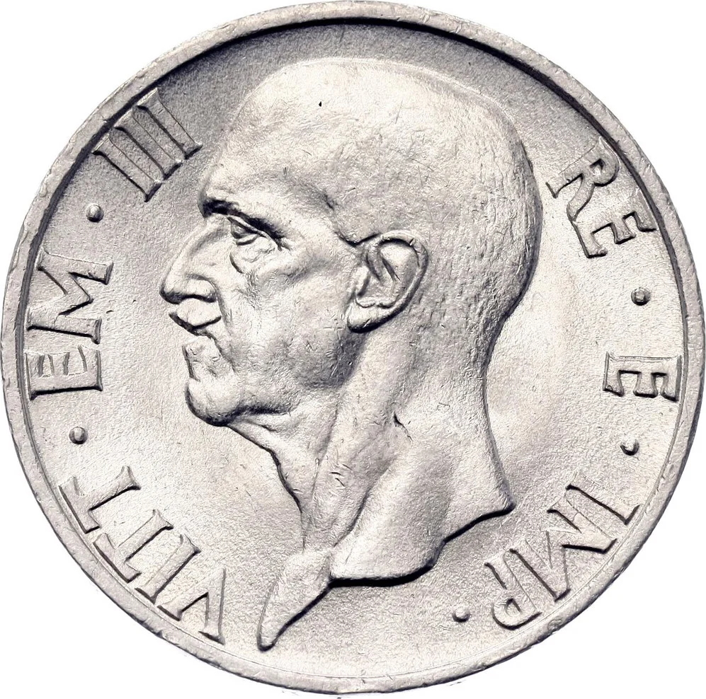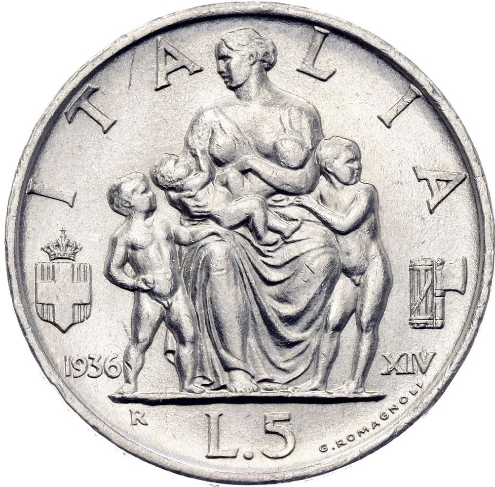 A seated female figure representing Fertility with four children, flanked by the crowned Savoy Shield (with standard date) and the Fascio Littorio (with Fascist Era year). The exergue contains the value and mintmark, with the engraver's name near the rim.
