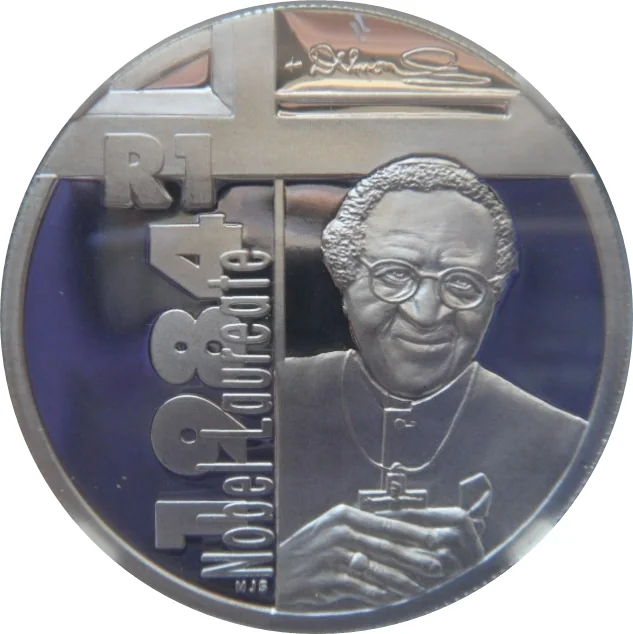 Tutu's full face, stylized cross left with signature above, "R1" and vertical "1984 Nobel Laureate" beside it.