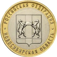 Coat of arms of the Novosibirsk Region. The rim is inscribed with "РОССИЙСКАЯ ФЕДЕРАЦИЯ" above and "НОВОСИБИРСКАЯ ОБЛАСТЬ" below.