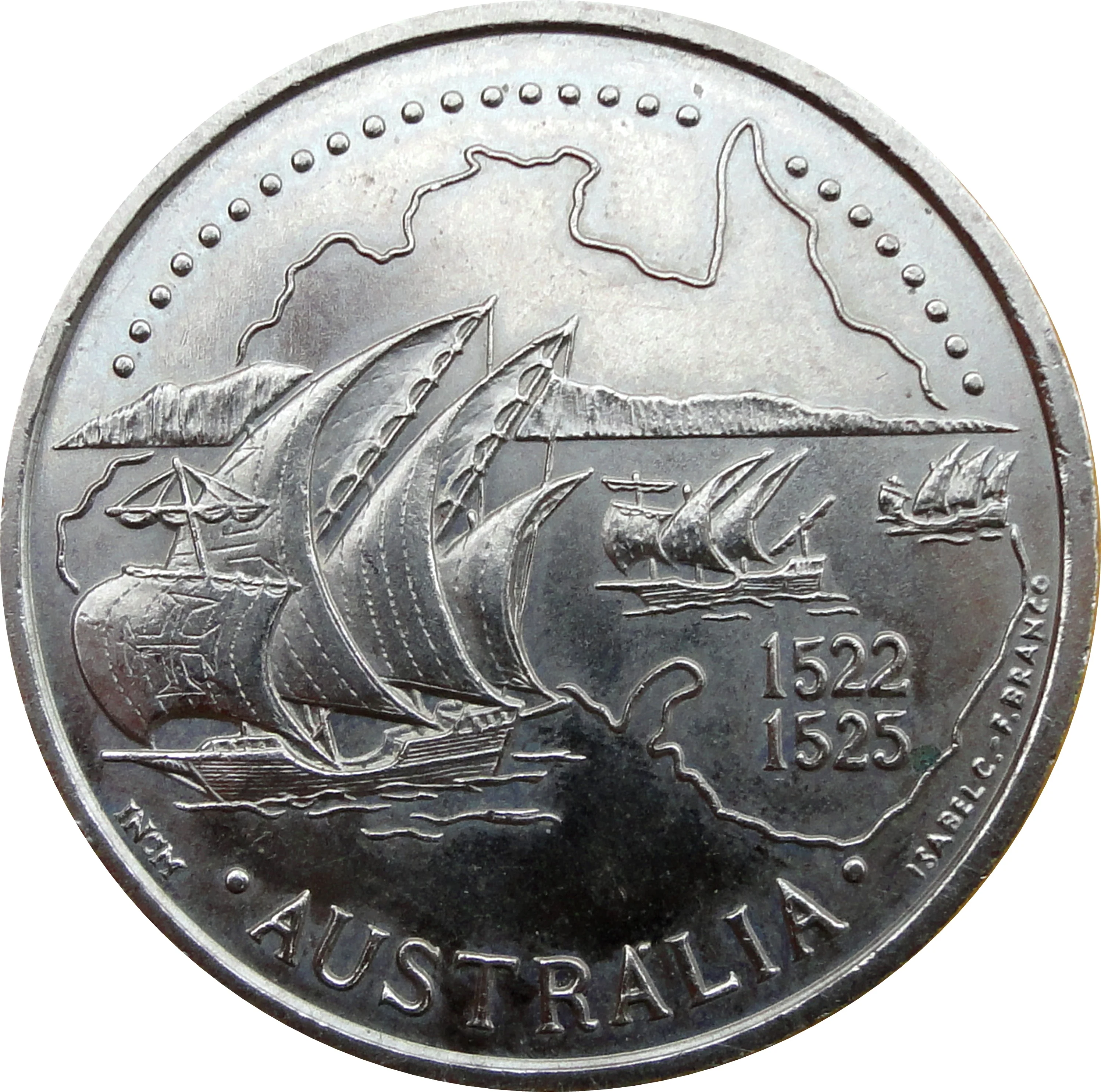 Three caravels sailing left over a map, referencing the disputed Portuguese discovery of Australia by Cristóvão de Mendonça before 1606.
