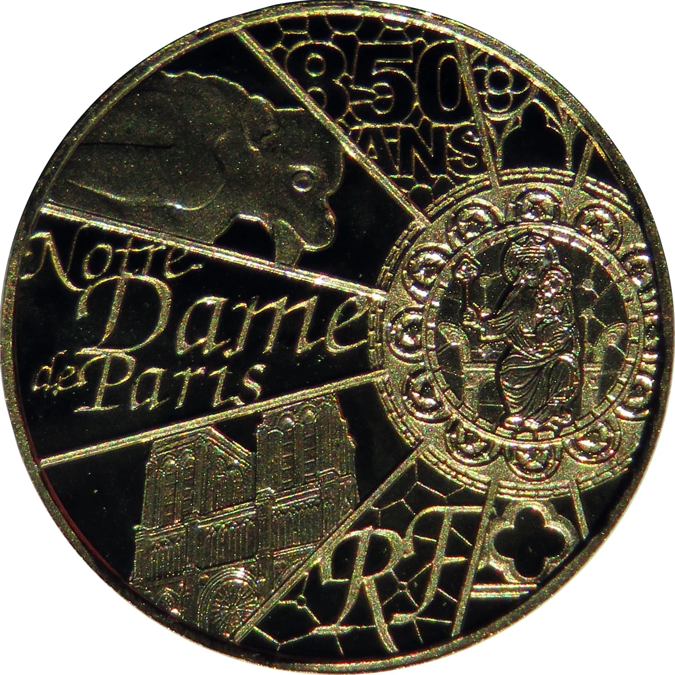 The coin depicts a section of the rose window, with inscriptions ("850 ANS," "Notre Dame de Paris," "RF") on solid areas and a gargoyle, the west facade, and architectural details in the open spaces.