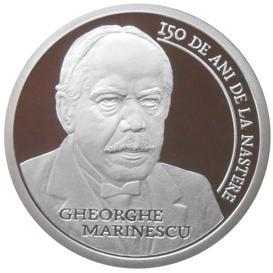 Portrait and name of Dr. Gheorghe Marinescu, founder of Romanian neurology, with the arched inscription "150 DE ANI DE LA NASTERE".