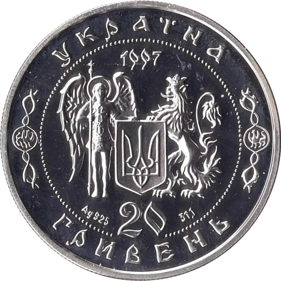 Description: The central design features the Holy Archangel Michael and the crowned Galician lion holding a shield with Ukraine's Trident emblem, symbolizing national unity. Above this is the year 1997. Around the coin's top edge is the inscription УКРАЇНА, with the face value 20 ГРИВЕНЬ below.