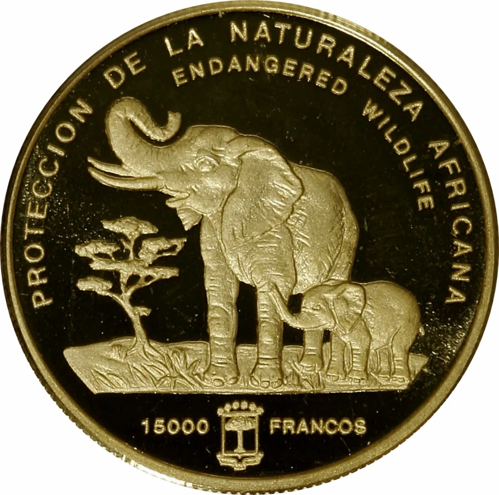 Elephant and cub left, tree. Coat of arms divides denomination.