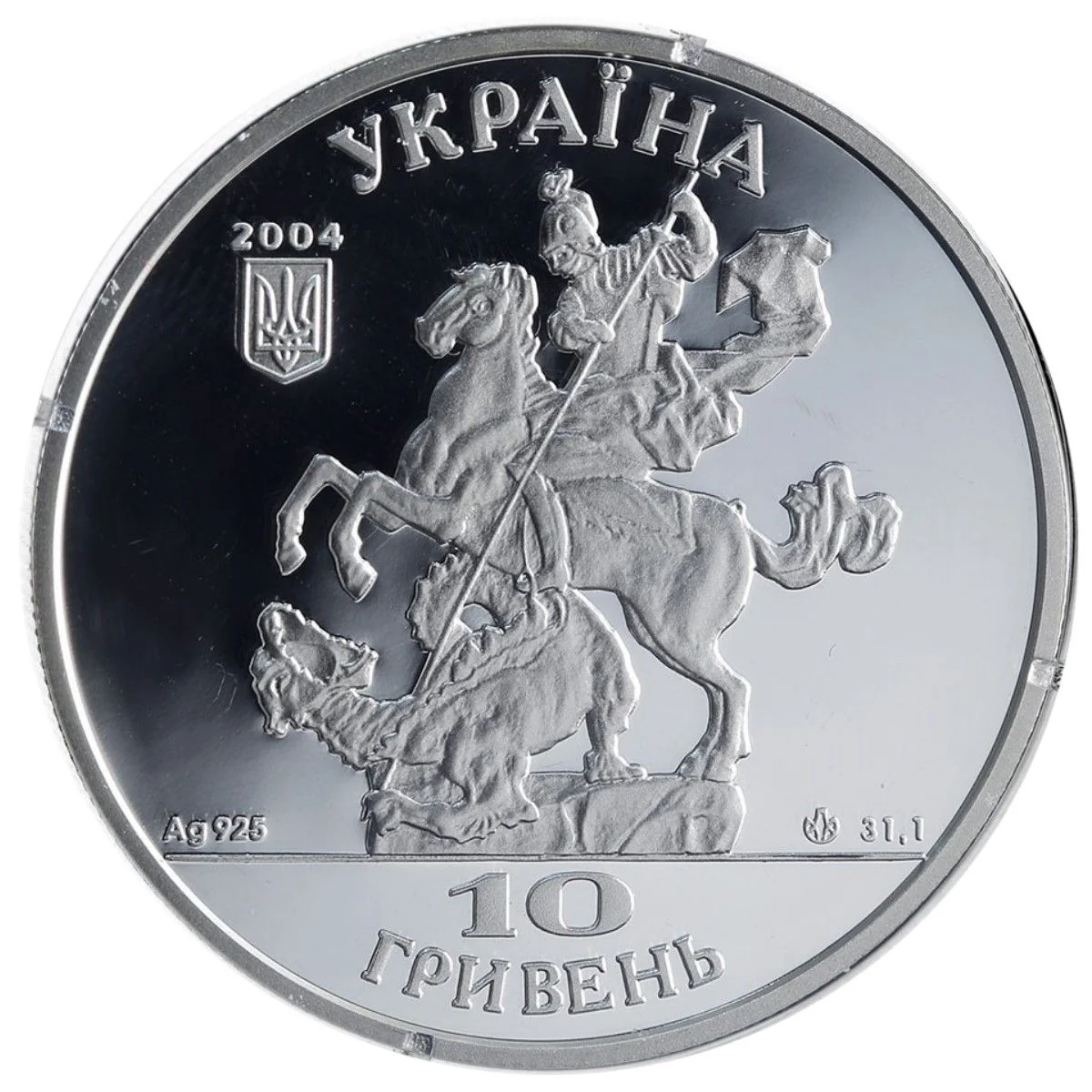 The coin features Johan Pinsel's statue of St. George (1759-1761) from the cathedral facade. To the left is the issue year 2004 above the small National Emblem. A semicircular inscription reads "УКРАЇНА 10 ГРИВЕНЬ," with the metal, fineness, and weight details below.