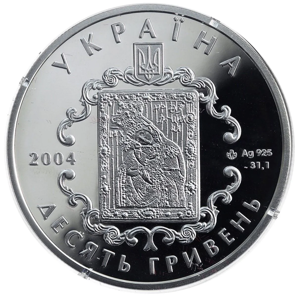 A traditional frame surrounds the Holy Mother icon from Dubno's St. Elias Church, donated by Prince Vasyl Konstiantyn. Above it is the small Ukrainian coat of arms with semicircular inscriptions: "УКРАЇНА" and "ДЕСЯТЬ ГРИВЕНЬ". Flanking the icon are the year 2004 and the Mint's logo, "Ag 925", and "31,1" (the weight).