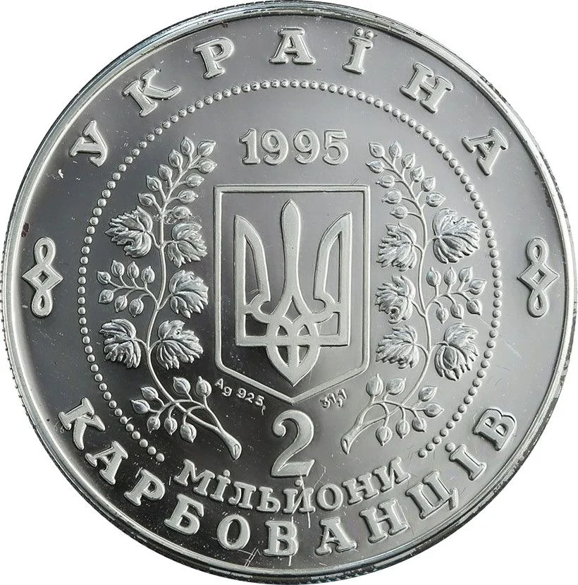 Description: The Small State Emblem of Ukraine is centered within a beaded circle, framed by guelder-rose sprays, with the year 1995 above it. The circumference bears the inscriptions "УКРАЇНА" above and "2 МІЛЬЙОНИ КАРБОВАНЦІВ" (or "2000000 КАРБОВАНЦІВ") below. On the silver coin, "Аg 925" and "31,1" (the pure weight) are placed below the emblem.
