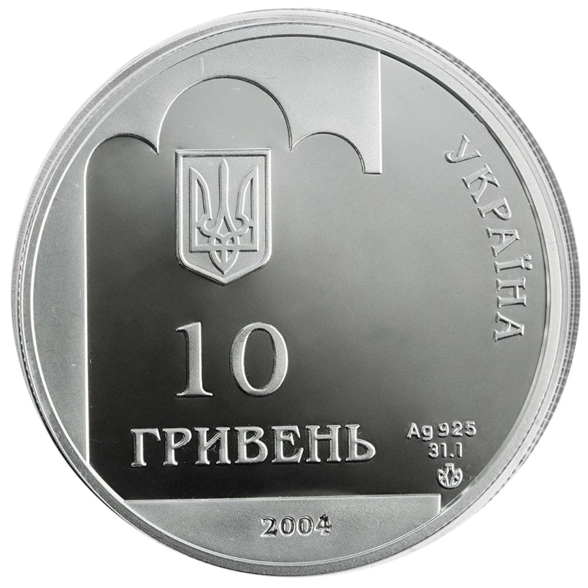 Against a three-arched Orthodox temple backdrop is the small National Emblem of Ukraine, with the denomination "10 ГРИВЕНЬ" below. To the right are the metal specifications, the Mint logo, the semicircular inscription "УКРАЇНА," and the year 2004.