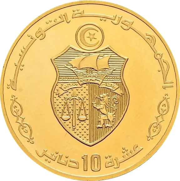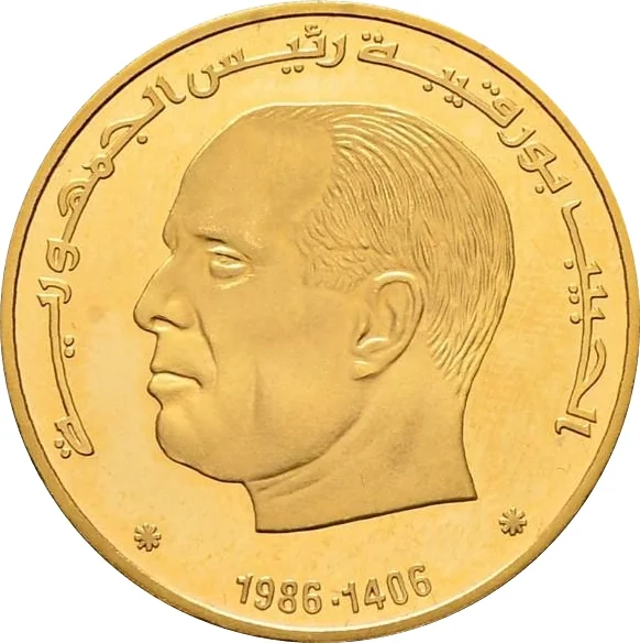 Head of Bourguiba facing left. Arabic legend around rim with Gregorian and Islamic dates below.