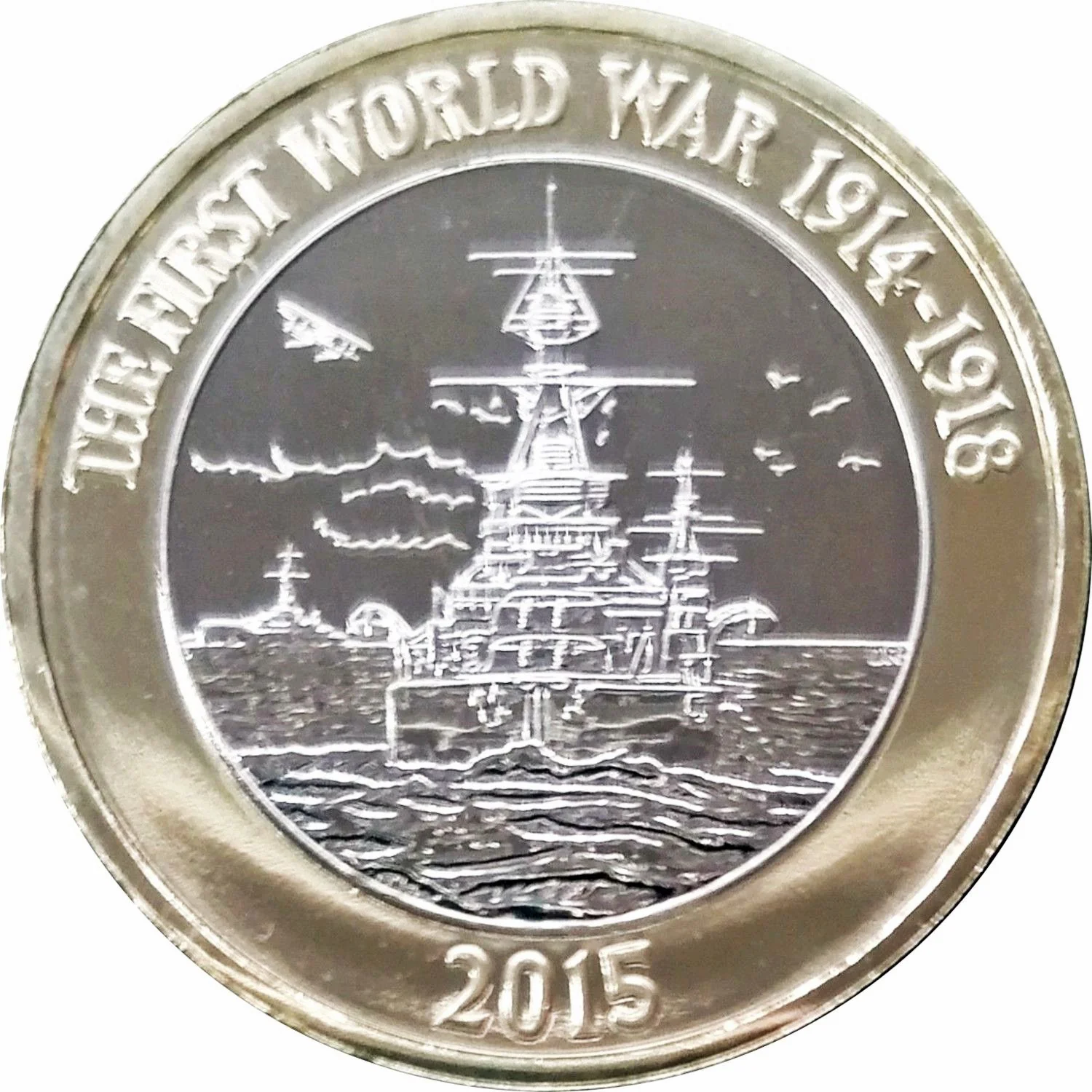 Dreadnought at sea, seaplane left, birds right, legend above, date below.