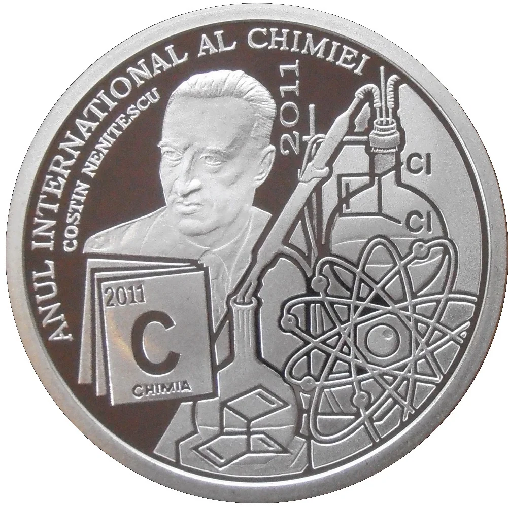 Costin Nenitescu, Romanian chemist with lab equipment and atom symbol.