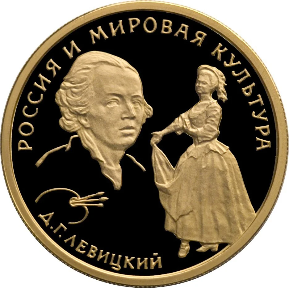 Left: Levitsky's portrait above a palette. Right: a fragment of his painting "Nelidova, a Graduate of the Smolny Institute." Rim inscriptions: top — "РОССИЯ И МИРОВАЯ КУЛЬТУРА," bottom — "Д.Г. ЛЕВИЦКИЙ."