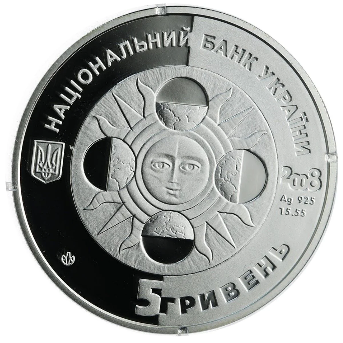 Description: The left side features a stylized Sun with four illuminated spheres representing the seasons. On the right are the Small National Emblem of Ukraine, the year 2008, and the metal specifications (Ag 925, 15.55). Circumferential inscriptions read "Національний банк України" and "5 Гривень," alongside the Mint's logotype.