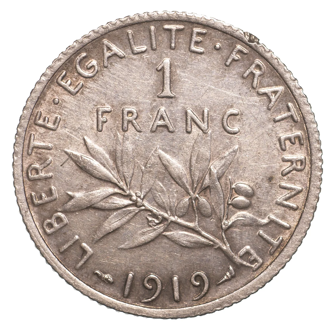 Beneath the face value, an olive branch encircles the French motto.