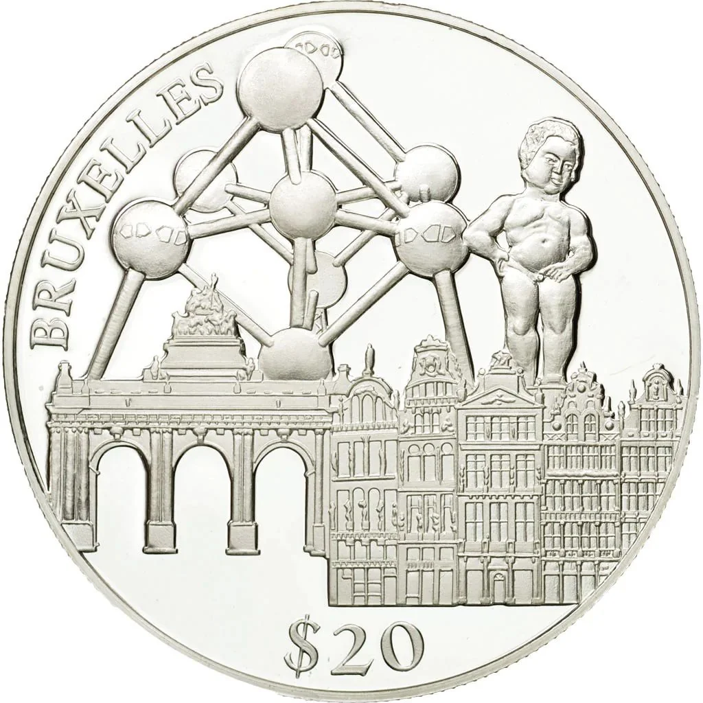 The Atomium, Manneken Pis, the Arcade du Cinquantenaire, and five Grand Place buildings: Le Renard, Le Cornet, La Louve, Le Sac, and La Brouette.