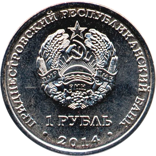 Central: State Emblem of the Transnistrian Moldovan Republic. Rim inscription: top - "ПРИДНЕСТРОВСКИЙ РЕСПУБЛИКАНСКИЙ БАНК", bottom - year "2014". Below emblem: denomination "1 РУБЛЬ".
