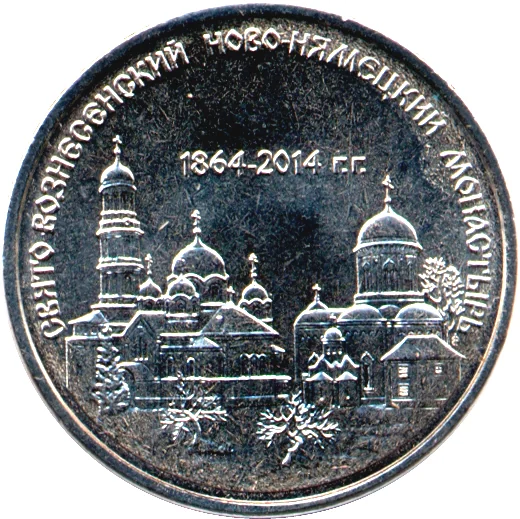 Center: the monastery. Above it: "1864-2014". Circular inscription at top: «СВЯТО-ВОЗНЕСЕНСКИЙ НОВО-НЯМЕЦКИЙ МОНАСТЫРЬ».
