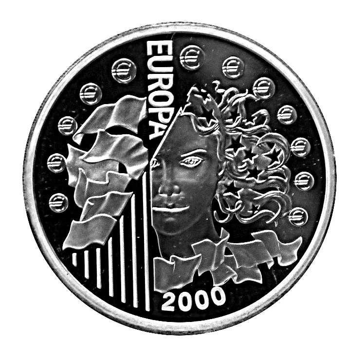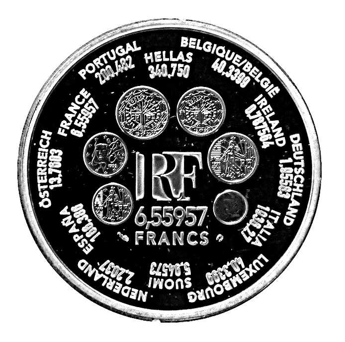 Central "RF" with "6.55957 francs". Circumference shows Euro Zone conversion rates. Between these and the value, an arc displays French euro coin samples (2 cent to 2 euro, 1999).