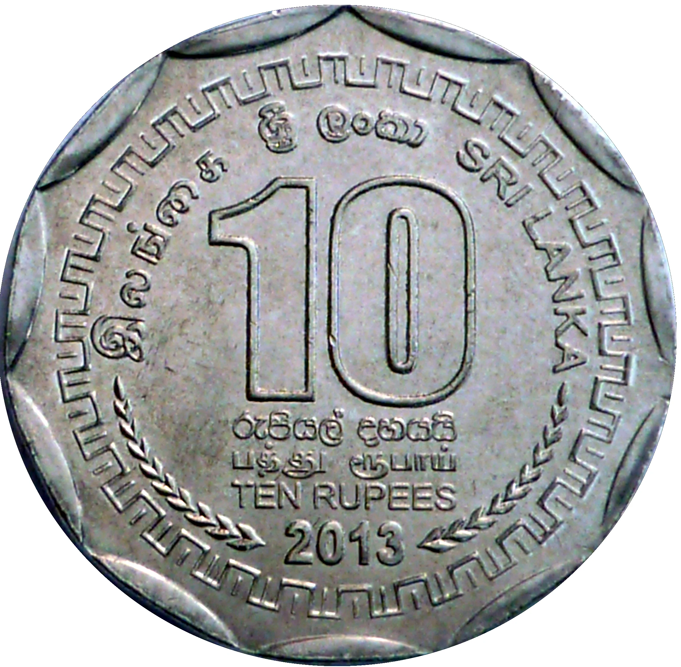 A central large 10 has "TEN RUPEES" in Sinhala, Tamil, and English below it. The year is flanked by rice ears. "SRI LANKA" appears at the top in Sinhalese, on the left in Tamil, and on the right in English, with a geometric border around the edge.