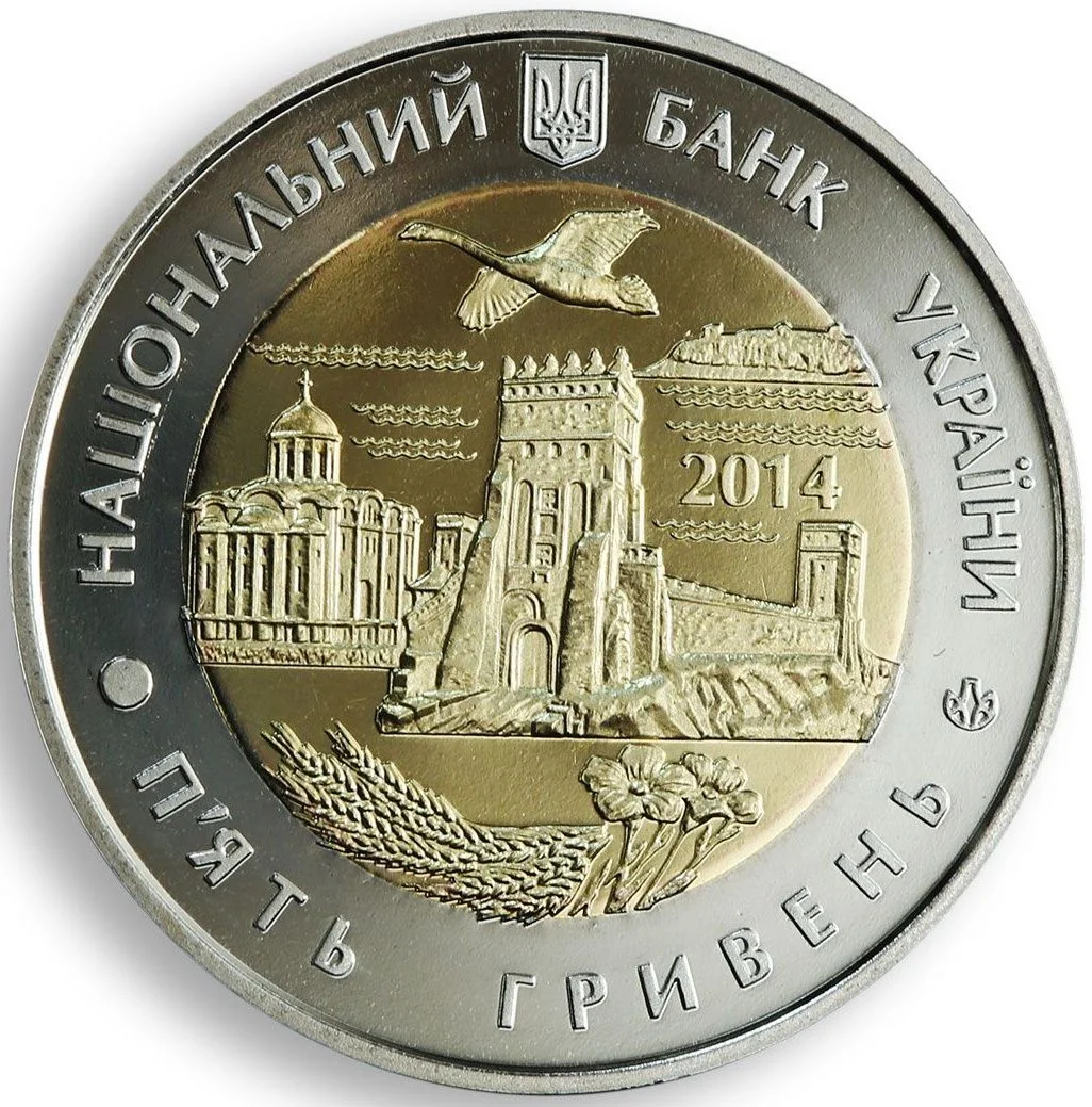 Obverse: Features Ukraine's Small Coat of Arms with inscriptions "НАЦІОНАЛЬНИЙ БАНК УКРАЇНИ" and "П'ЯТЬ ГРИВЕНЬ." It includes the mint mark, a composition with the Lutsk High Castle tower, Volodymyr-Volynskyi's Assumption Cathedral, an island on Lake Svitiaz (above the 2014 issue year), a swan, and grain ears with flax flowers.