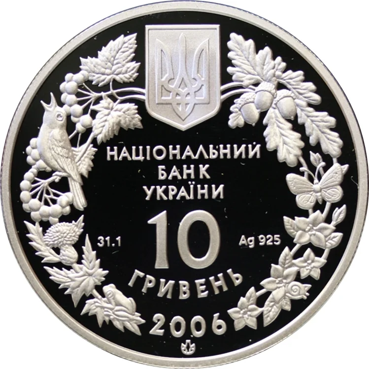 Description: Encircled by flora and fauna, it features Ukraine's Small National Emblem, the inscriptions "НАЦІОНАЛЬНИЙ БАНК УКРАЇНИ 10 ГРИВЕНЬ 2006", the metal specification "Ag 925", the fine weight of 31.1g, and the Mint's logo.