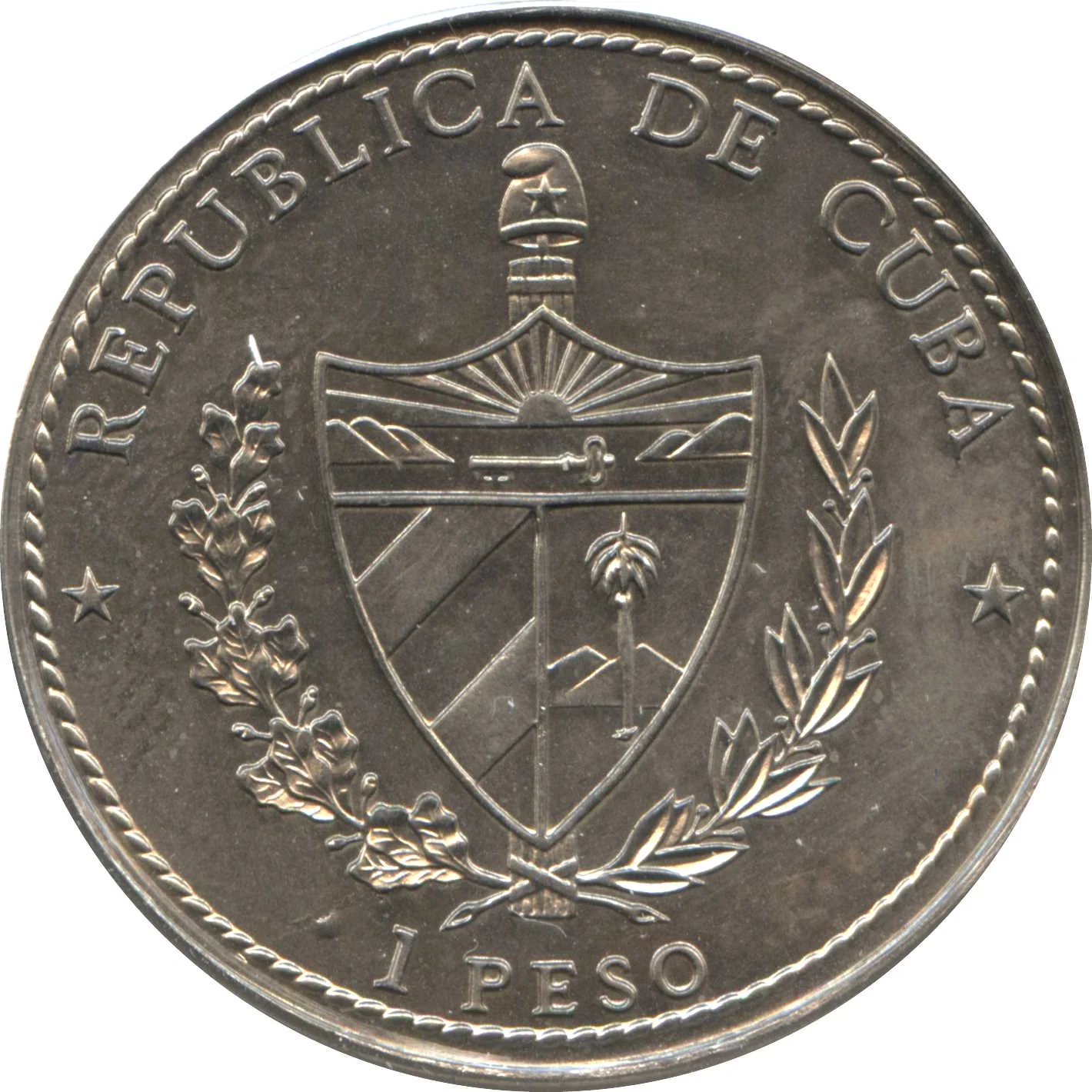 Cuban coat of arms, curved country name above, face value below, flanked by two stars, rope border.