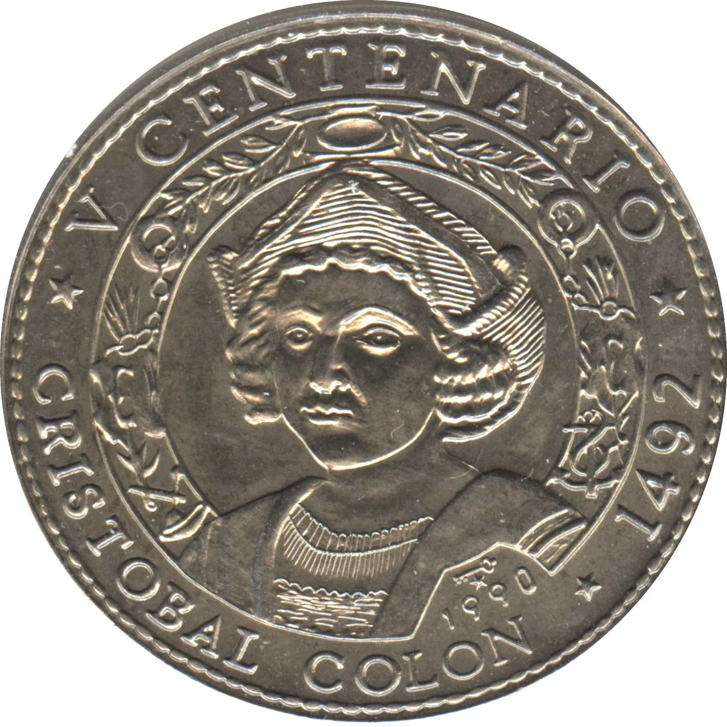 Bust of Columbus with olive wreath and naval items. Name below, event and date above and right. Mintmark and issue date below, encircled by a rope border.