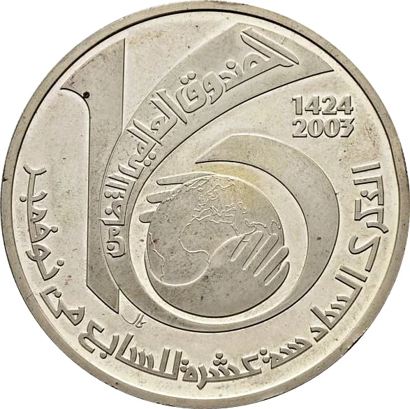 Description: "16" with a globe held within the "6" and "International Solidarity Fund" on its banner. Arabic text included.