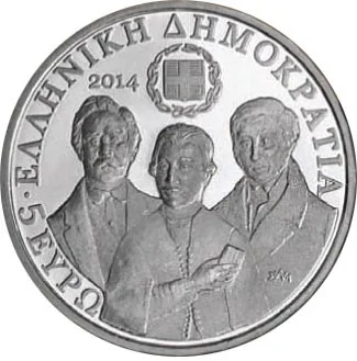 Portrait of Filiki Etaireia founders Emmanouil Xanthos, Nikolaos Skoufas, and Athanasios Tsakalov. Encircled by the text "HELLENIC REPUBLIC", the denomination "5 EURO", the National Crest, and the year "2014".