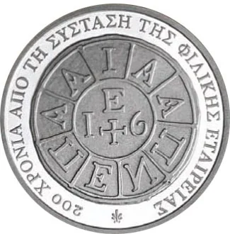 The Stamp of Filiki Etaireia, encircled by Greek text marking "200 YEARS FROM THE FOUNDATION OF THE PHILIKI ETAIRIA," and the palmette symbol of the Greek Mint.