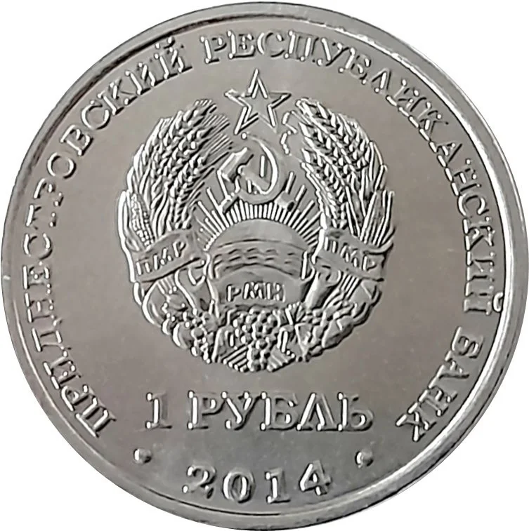Center: State Emblem of the Transnistrian Moldovan Republic. Rim: top - "ПРИДНЕСТРОВСКИЙ РЕСПУБЛИКАНСКИЙ БАНК", bottom - year "2014". Below emblem: denomination "1 РУБЛЬ".