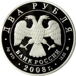 Center: The Bank of Russia emblem (two-headed eagle with wings down, over "БАНК РОССИИ"), within a dotted circle. Rim inscription: top - "ДВА РУБЛЯ"; bottom left - metal and fineness, center - "2008", right - metal weight and mint mark.