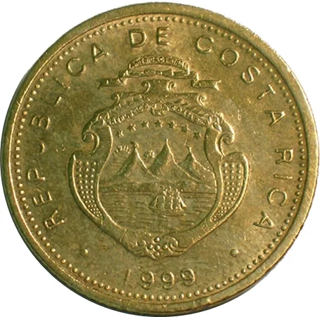 Costa Rican coat of arms: seven stars for the provinces, three volcanoes for the mountain ranges, two ships between oceans, and a sunrise. Letter size and spacing vary by mintage.