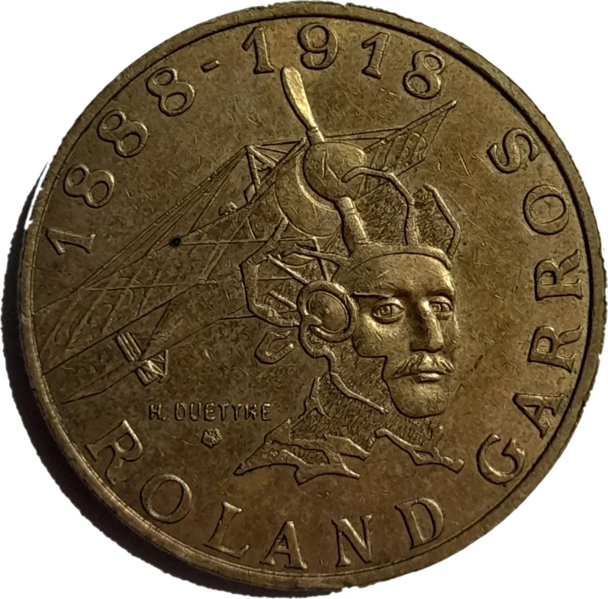 Circular legend "ROLAND GARROS 1888 - 1918" / Center: Morane-Saulnier type N plane and bust of Roland Garros / Below: signature "H. DHUETTHE". Pioneer aviator, he completed the first Mediterranean crossing on September 23, 1913.
