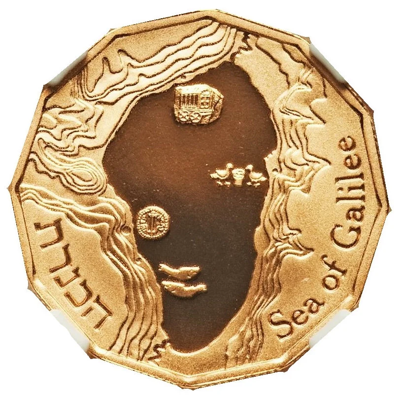 Aerial view of the Sea of Galilee (Kinneret) with artifacts: a Tiberias coin (2nd C.), zodiac mosaic from Hamat Tiberias (3rd-4th C.), relief from Capernaum (3rd-4th C.), and mosaic from Kursi.