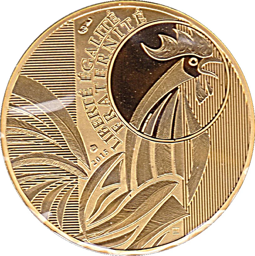 A stylized rooster in profile. Above it, France's motto "LIBERTÉ ÉGALITÉ FRATERNITÉ" arcs along the coin's circle. The background features the French flag in heraldic patterns.